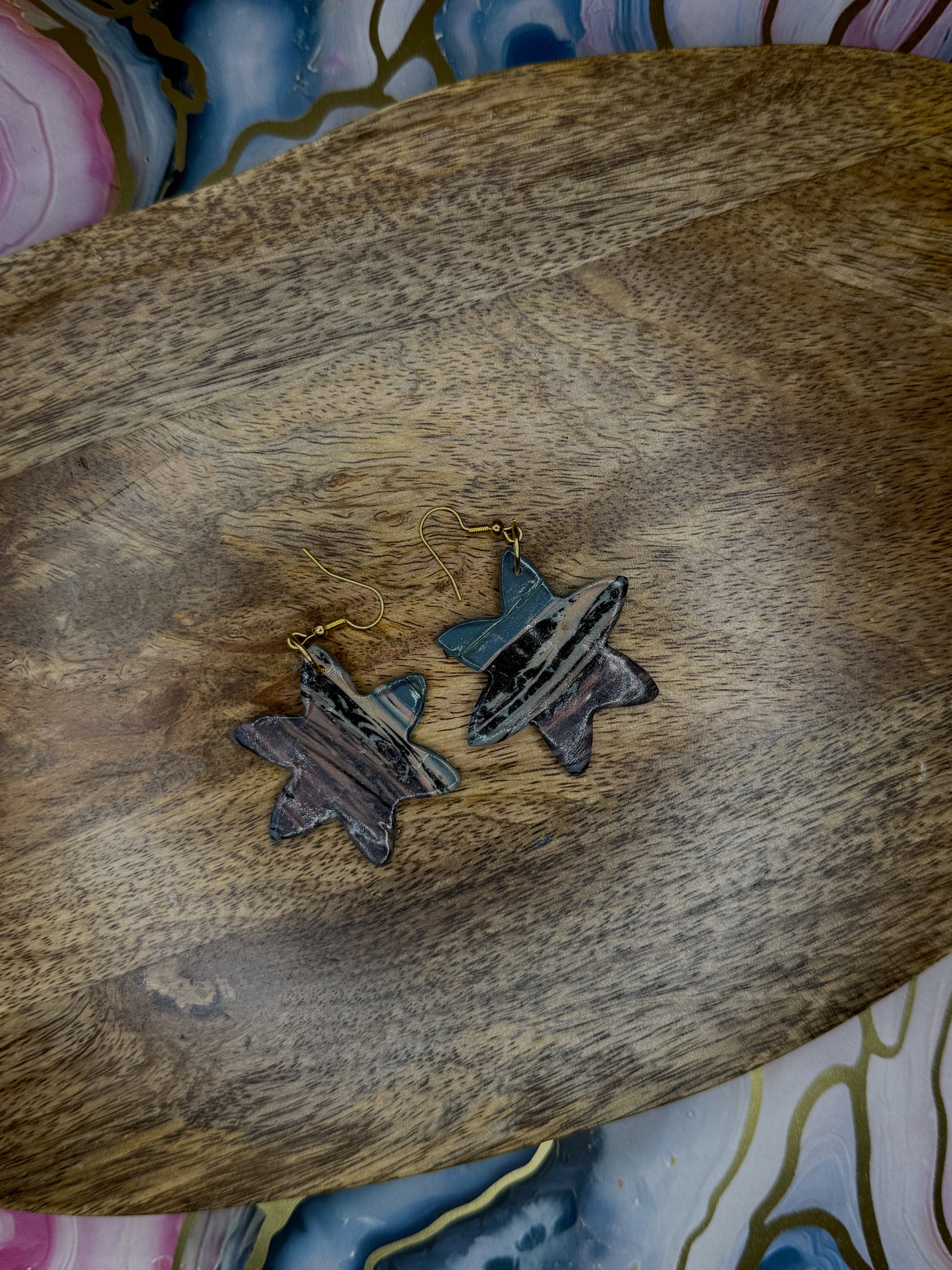These lightweight dangles feature a soft six-point shape and are made from our marbled scrap clay — a swirling mix of colors created from the bits left behind during other projects. Each pair is completely unique, with patterns that resemble flowing ink or layered stone. Finished with stainless steel hardware for comfort and shine.