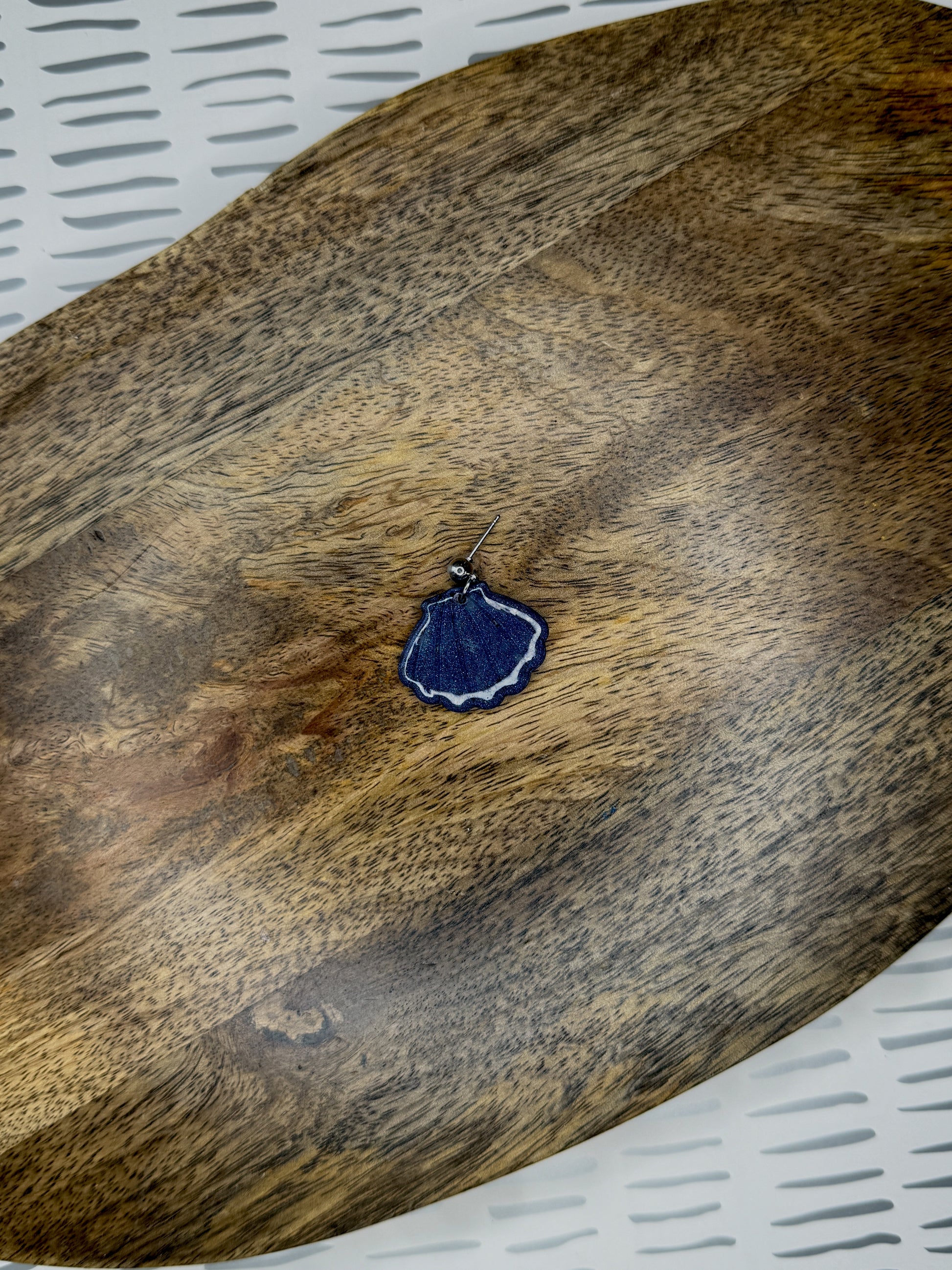Shimmer like the tide with these dreamy scallop shell earrings, designed to catch the light and the eye. 3D printed in a rich purple filament with subtle blue sparkle and iridescence, each pair is coated in clear resin for a glossy, pearl-like finish that adds extra depth and shine.