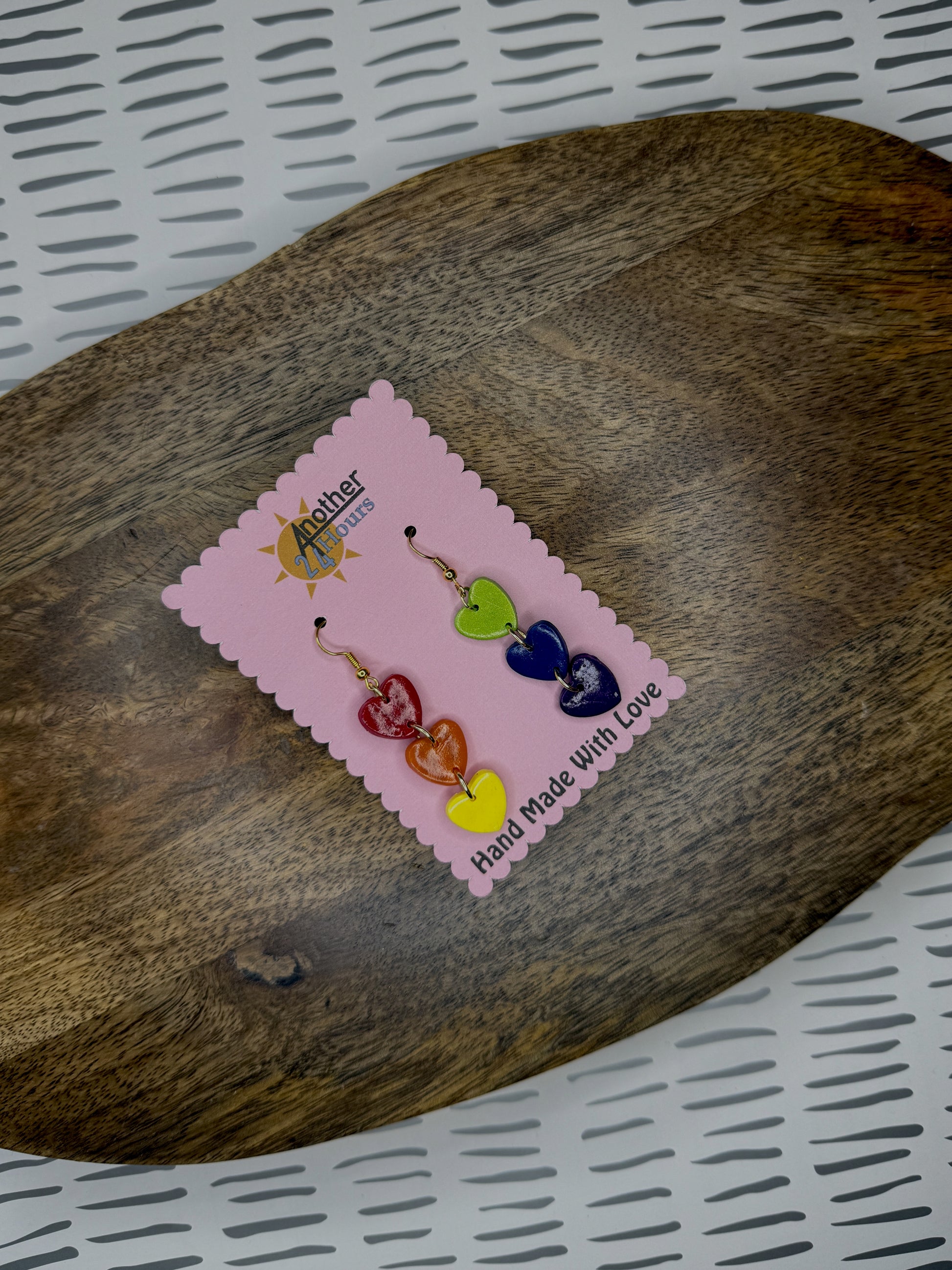 Celebrate love in full color with these handmade rainbow heart dangles. Featuring a playful cascade of polymer clay hearts, this vibrant pair is full of joyful movement and Pride spirit — bold, bright, and made to stand out.
