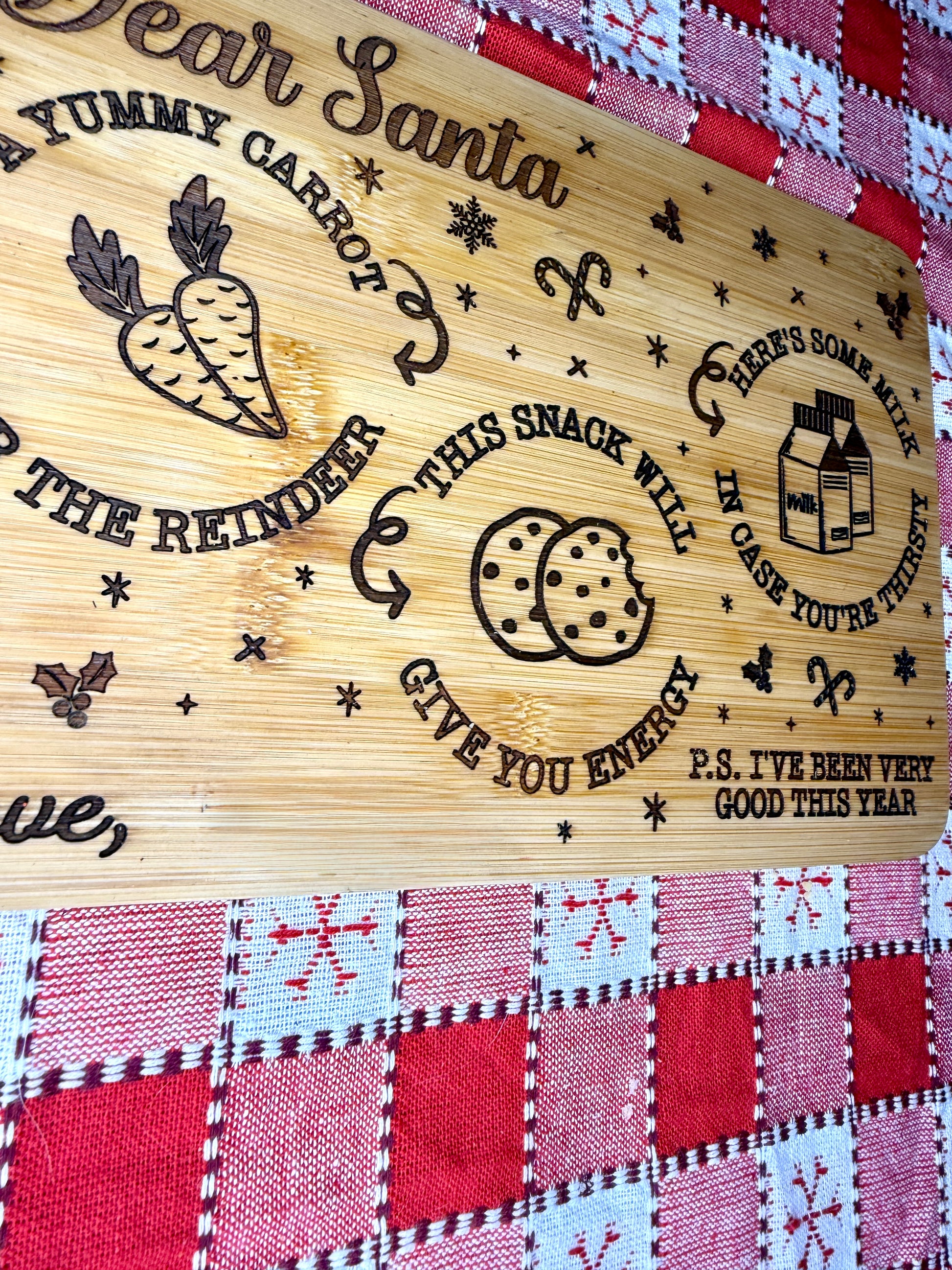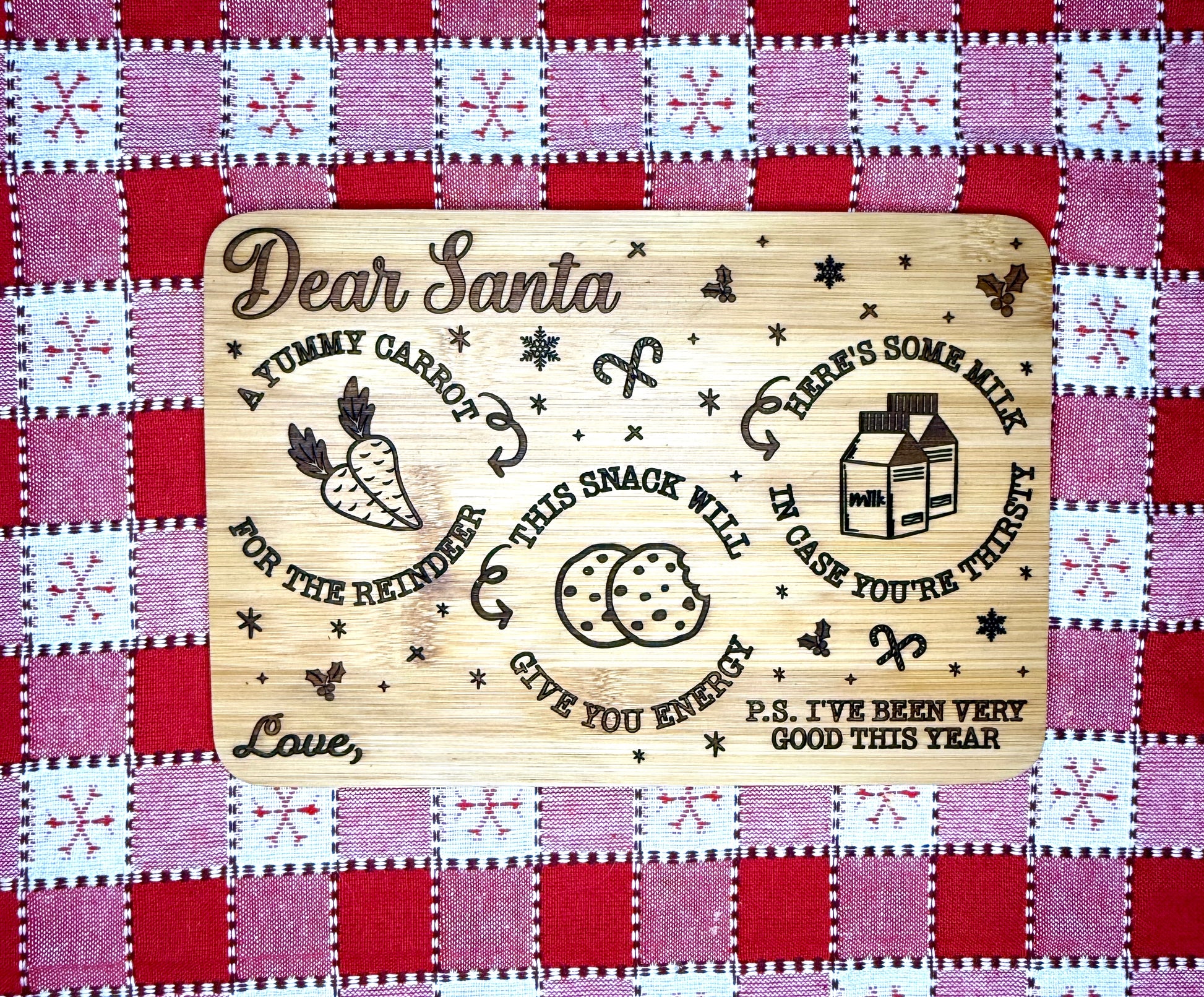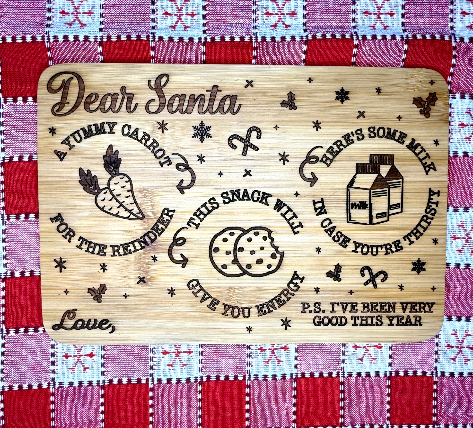 Make Christmas morning unforgettable with this charming 10" x 7" bamboo serving tray, perfect for setting out cookies, milk, and holiday magic. Crafted from sustainable, durable bamboo, it’s not only eco-friendly but built to last—making it a beautiful keepsake year after year.