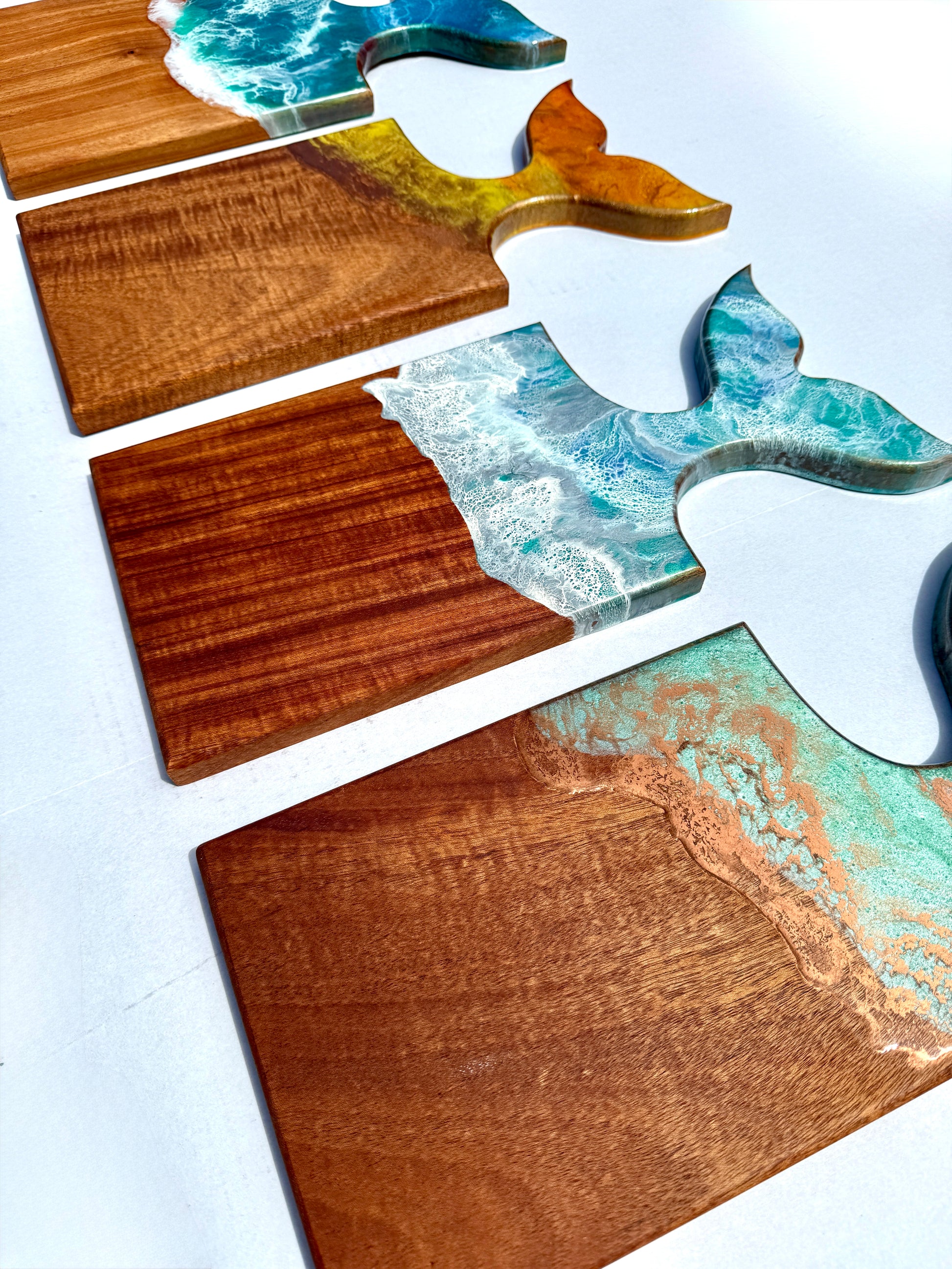 Make a statement at your next gathering with this handcrafted solid mahogany serving board, featuring a unique whale tail shape and custom resin design. Measuring 7 x 15 inches, each piece is handmade and one-of-a-kind. Choose your favorite resin color palette or request a custom design to make it uniquely yours.